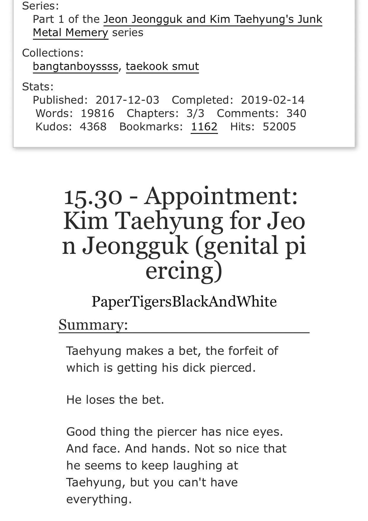 Twitter 上的 Bts Fic Rec 15 30 Appointment Kim Taehyung For Jeon Jeongguk Genital Piercing By Papertigersblackandwhite Jungkook Taehyung Words 19816 Taehyung Gets His Dick Pierced And Meets Jungkook Switch Taekook Fluff Jungkook
